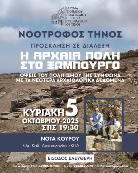 ΝΟΟΤΡΟΦΟΣ ΤΗΝΟΣ Την Κυριακή 5 Οκτωβρίου 2025, στις 7:30 μ.μ., το Διοικητικό Συμβούλιο του Ιδρύματος Τηνιακού Πολιτισμού σας προσκαλεί στη διάλεξη της ομ. καθηγήτριας Αρχαιολογίας