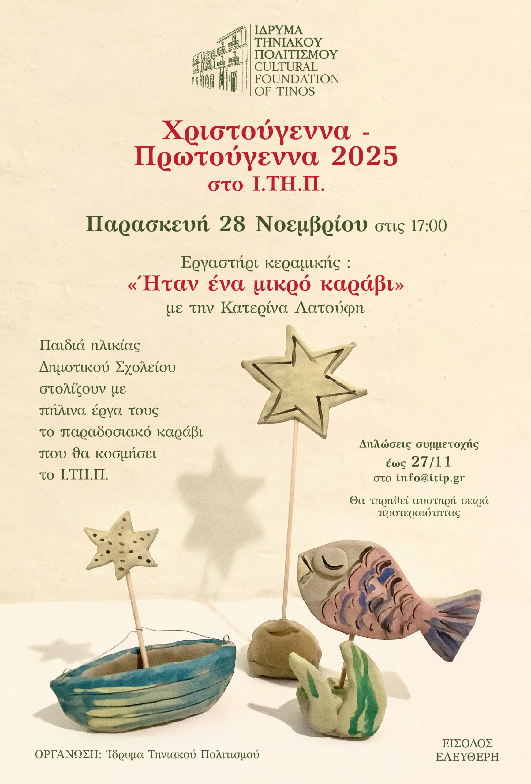 Το Δ.Σ. του Ιδρύματος Τηνιακού Πολιτισμού προσκαλεί παιδιά ηλικίας τάξεων Δημοτικού Σχολείου στο εργαστήρι κεραμικής «Ήταν ένα μικρό καράβι», την Παρασκευή 28 Νοεμβρίου 2025.