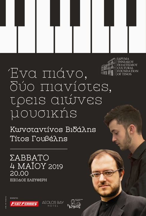 Μαθητής και δάσκαλος, Κωνσταντίνος Βιδάλης και Τίτος Γουβέλης, παρουσιάζουν ένα πανόραμα διάσημων πιανιστικών έργων που καλύπτουν ένα φάσμα τριών αιώνων μουσικής δημιουργίας, από τον Μότσαρτ (18ος αιώνας) ως τον Προκόφιεφ (20ος). Ο νεαρός, ταλαντούχος μουσικός Κωνσταντίνος Βιδάλης παρουσιάζει έργα πέντε συνθετών, που εκπροσωπούν διαφορετικές εποχές και στιλ – πιο συγκεκριμένα τον κλασικισμό (Μότσαρτ, Μπετόβεν), τον Ρομαντισμό (Γκρηγκ), τον Ιμπρεσιονισμό (Ντεμπυσύ) και τον Μοντερνισμό (Προκόφιεφ). Η μελέτη αυτών των γοητευτικών και συγχρόνως απαιτητικών έργων έγινε στο πλαίσιο της μαθητείας του κοντά στον πιανίστα Τίτο Γουβέλη (σολίστ και καθηγητή του Ωδείου Αθηνών), ο οποίος στην πρώτη του εμφάνιση στην Τήνο ερμηνεύει ένα από τα συγκλονιστικότερα έργα του ρομαντικού ρεπερτορίου, τις Εικόνες από μία έκθεση του Ρώσου συνθέτη Μόντεστ Μούσοργκσκυ. Το επικό αυτό έργο αποτυπώνει με ενάργεια και λεπταίσθητη περιγραφικότητα την επίσκεψη του Μούσοργκσκυ σε μία έκθεση έργων του ζωγράφου Βίκτορ Χάρτμαν (1934 – 1873) που πραγματοποιήθηκε λίγο μετά (1874) τον αιφνίδιο θάνατό του. Η συναυλία θα κλείσει με σύντομη σύμπραξη μαθητή και δασκάλου στο εύθυμο κομμάτι (Humoresque) του Λέοπολντ Γκοντόφσκυ, ενός από τους μεγαλύτερους πιανίστες όλων των εποχών.Τίτος Γουβέλης (σύντομο βιογραφικό σημείωμα)Γεννήθηκε στην Αθήνα. Σπούδασε πιάνο με τους Άρη Γαρουφαλή, Peter Katin, Fali Pavri και Dominique Merlet. Παράλληλα μελέτησε εκκλησιαστικό όργανο με τον Nicolas Kynaston. Έχει κερδίσει βραβεία σε πανελλήνιους και διεθνείς διαγωνισμούς πιάνου και μουσικής δωματίου και έχει βραβευθεί από την Ακαδημία Αθηνών. Ως σολίστ έχει συμπράξει με τη Βασιλική Εθνική Ορχήστρα της Σκωτίας, την Κρατική Φιλαρμονική της Τρανσυλβανίας, τις Κρατικές Ορχήστρες Αθηνών και Θεσσαλονίκης, την Εθνική Συμφωνική Ορχήστρα της ΕΡΤ, την Καμεράτα, τη Συμφωνική Ορχήστρα Κύπρου, τη Συμφωνική Ορχήστρα του Δήμου Αθηναίων, την Academica Αθηνών κ.ά. Δίνει τακτικά ατομικά ρεσιτάλ και συναυλίες μουσικής δωματίου σε Ελλάδα και εξωτερικό (Μεγ. Βρετανία, Γερμανία, Αυστρία, Ολλανδία, Ρουμανία, Σερβία, Τουρκία, Νότιο Κορέα, Νιγηρία και Κύπρο) συνεργαζόμενος με σημαντικούς Έλληνες και ξένους καλλιτέχνες και μουσικά σύνολα. Από τις σταθερές και πολύχρονες μουσικές του συνεργασίες ξεχωρίζουν αυτές με τον βιολοντσελίστα Άγγελο Λιακάκη, με τον πιανίστα Χαράλαμπο Αγγελόπουλο και με την υψίφωνο Μάιρα Μηλολιδάκη. Διδάσκει πιάνο στο Ωδείο Αθηνών και στο Ωδείο Ν. Μάντζαρος. Το ευρύ ρεπερτόριό του εκτείνεται από το μπαρόκ μέχρι και τον 21ο αιώνα. Σημαντική θέση σε αυτό κατέχει η ελληνική δημιουργία· έχει ερμηνεύσει έργα άνω των 60 Ελλήνων συνθετών, περιλαμβανομένων και αρκετών πρώτων εκτελέσεων. Παράλληλα είναι συντάκτης και επιμελητής των προγραμμάτων της Κρατικής Ορχήστρας Αθηνών, ενώ κείμενά του φιλοξενούνται συχνά στα προγράμματα του Μεγάρου Μουσικής Αθηνών.ΗΜΕΡΟΜΗΝΙΑ: 4 ΜΑΪΟΥ 2019, στις 20:00