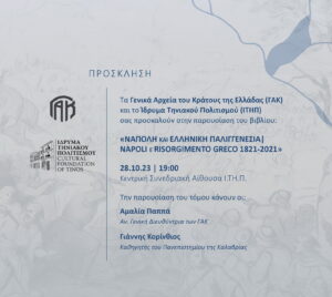 Τα Γενικά Αρχεία του Κράτους της Ελλάδας (ΓΑΚ) και το Ίδρυμα Τηνιακού Πολιτισμού σας προσκαλούν στην παρουσίαση του βιβλίου: «ΝΑΠΟΛΗ ΚΑΙ ΕΛΛΗΝΙΚΗ ΠΑΛΙΓΓΕΝΕΣΙΑ/ 1821-2021/ NAPOLI E RISORGIMENTO GRECO».