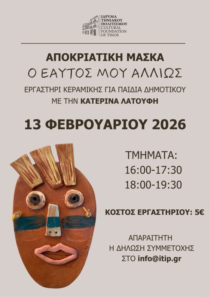 Την Παρασκευή 13 Φεβρουαρίου 2026, τα παιδιά δημοτικού θα έχουν την ευκαιρία να δημιουργήσουν τη δική τους αποκριάτικη μάσκα, πειραματιζόμενα με τον πηλό και, παράλληλα, θα προσεγγίσουν δημιουργικά την έννοια της αυτοέκφρασης και της ταυτότητας.