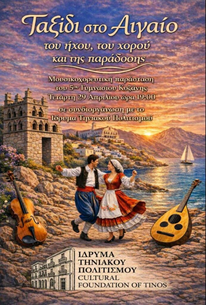 Το 5ο Γυμνάσιο Κοζάνης παρουσιάζει τη μουσικοχορευτική παράσταση με τίτλο «Ταξίδι στο Αιγαίο του ήχου, του χορού και της παράδοσης», σε συνδιοργάνωση με το Ίδρυμα Τηνιακού Πολιτισμού.