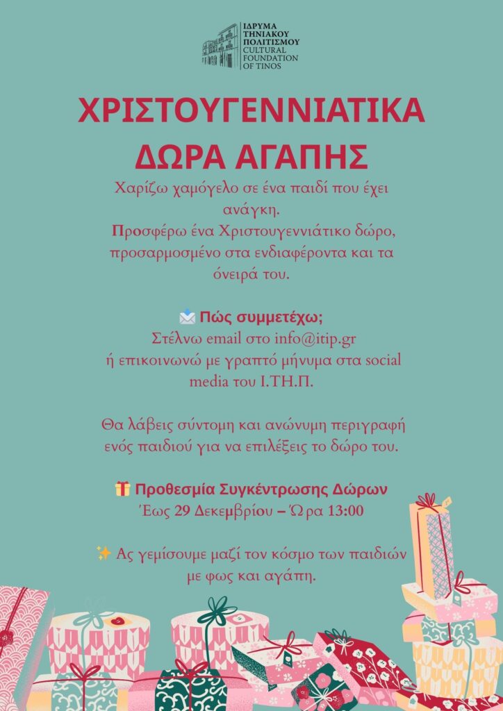Το Ίδρυμα Τηνιακού Πολιτισμού διοργανώνει τη δράση «Χριστουγεννιάτικα Δώρα Αγάπης», μια πρωτοβουλία που στόχο έχει να προσφέρει χαμόγελα σε παιδιά της τοπικής κοινότητας που έχουν ανάγκη. Η δράση καλεί τους κατοίκους και φίλους της Τήνου να γίνουν μέρος μιας ζεστής, γιορτινής προσπάθειας αλληλεγγύης, χαρίζοντας ένα δώρο σε ένα παιδί.