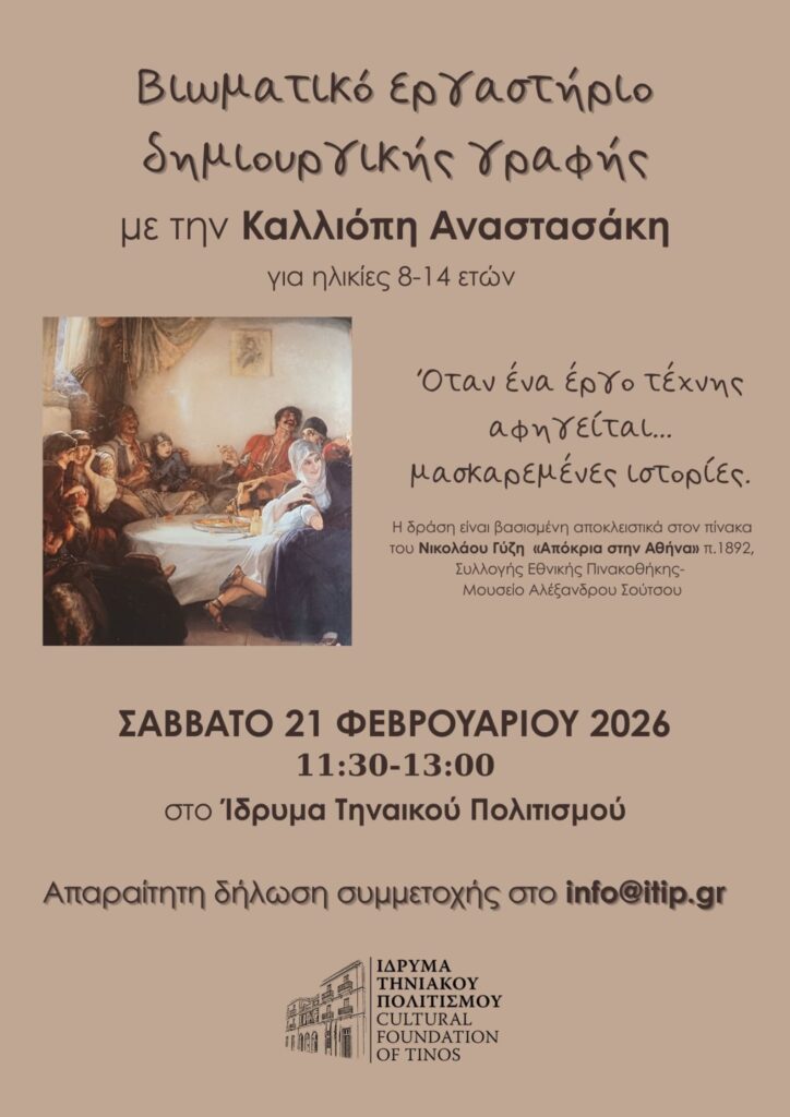 Με αφορμή τον πίνακα του Νικολάου Γύζη «Αποκριά στην Αθήνα», τα παιδιά θα γνωρίσουν τον κόσμο της τέχνης και της αφήγησης. Με τη βοήθεια των τεχνικών της δημιουργικής γραφής, τα παιδιά θα δώσουν τη δική τους φωνή στους ήρωες του έργου και θα πλάσουν μοναδικές, “μασκαρεμένες” ιστορίες.